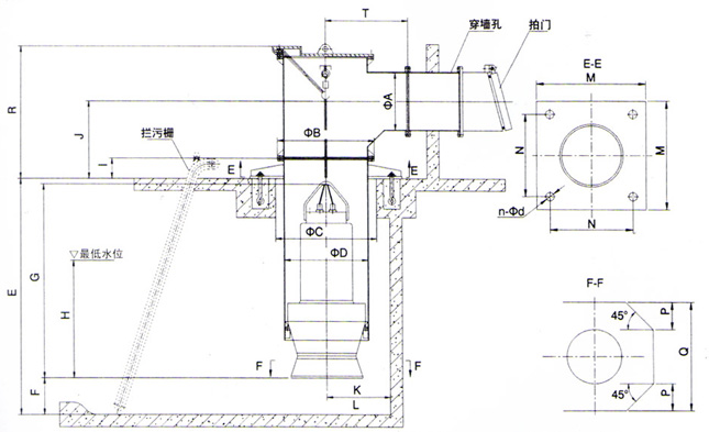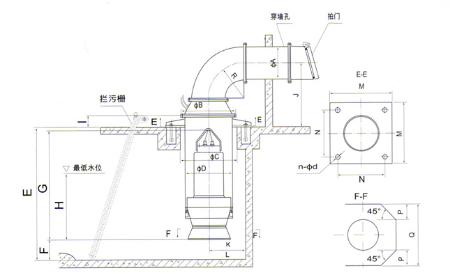 (1)、進水流道可配肘形、鐘形、簸箕形流道,安裝尺寸表中的流道尺寸為簸箕形流道(僅供參考)。